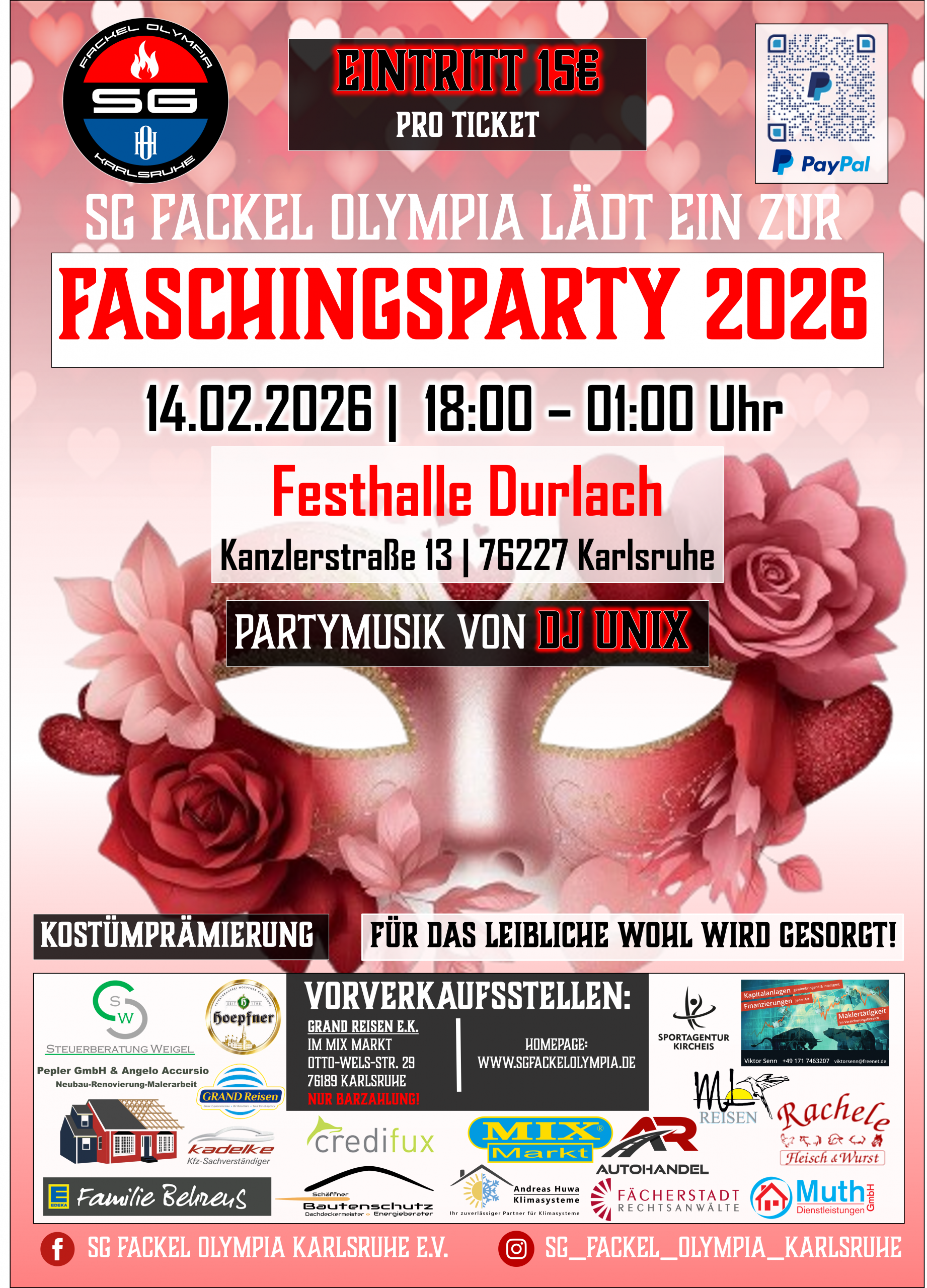 es ist mal wieder soweit: Die SG Fackel Olympia lädt auch im Jahr 2026 zur legendären Faschingsparty ein! Und dieses Mal hat es der Veranstaltungsgott besonders gut mit uns – und ganz besonders mit der Männerwelt – gemeint.